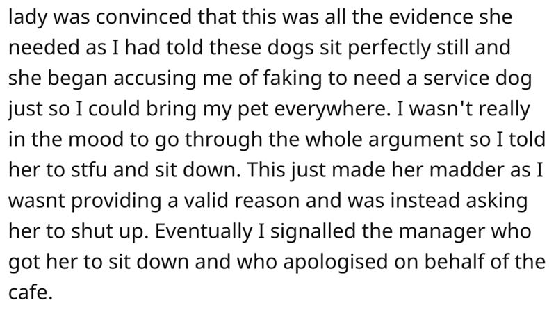 4. The woman was not agreeing with the fact that it was a service dog and instead made OP more comfortable, when OP gave her a shut up call she got mad and the manager had to come to handle the situation and apologize