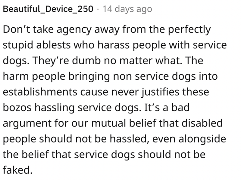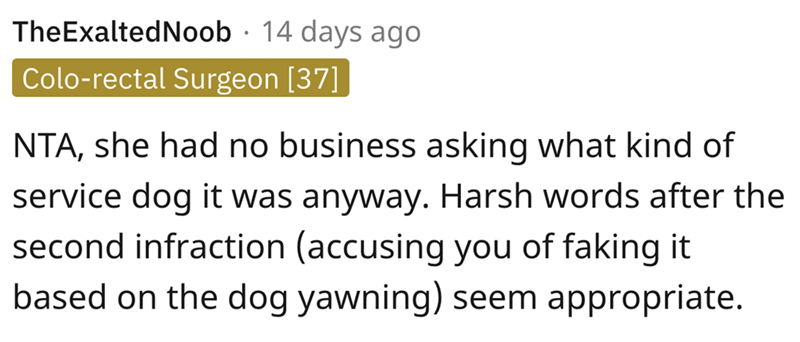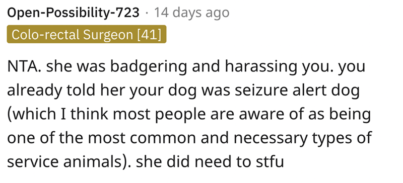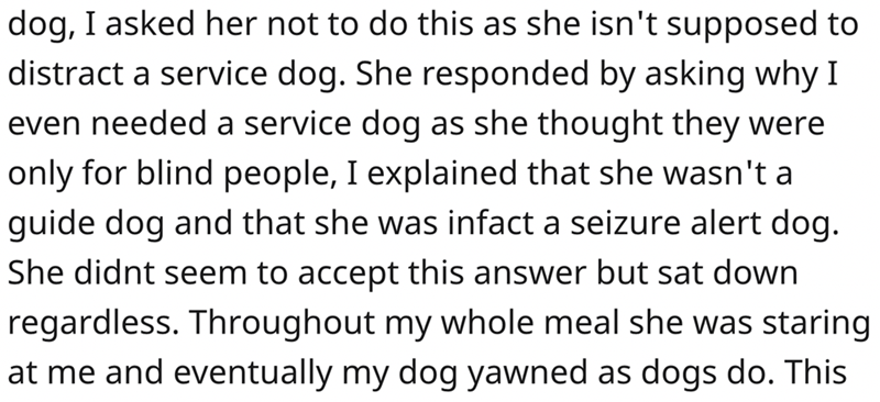 3. The woman was making noises at the dog when OP asked her to stopped she asked about the dog and did not believe that he was a seizure alert dog