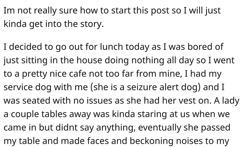 2. OP went to lunch with their service dog and a woman passed by making faces which really pissed OP off