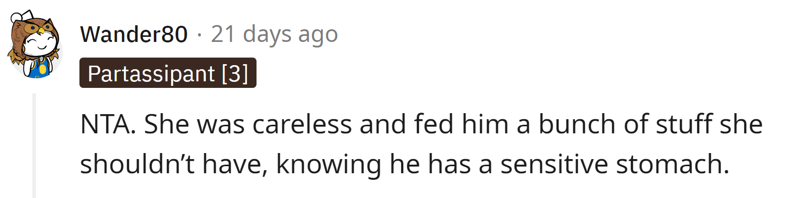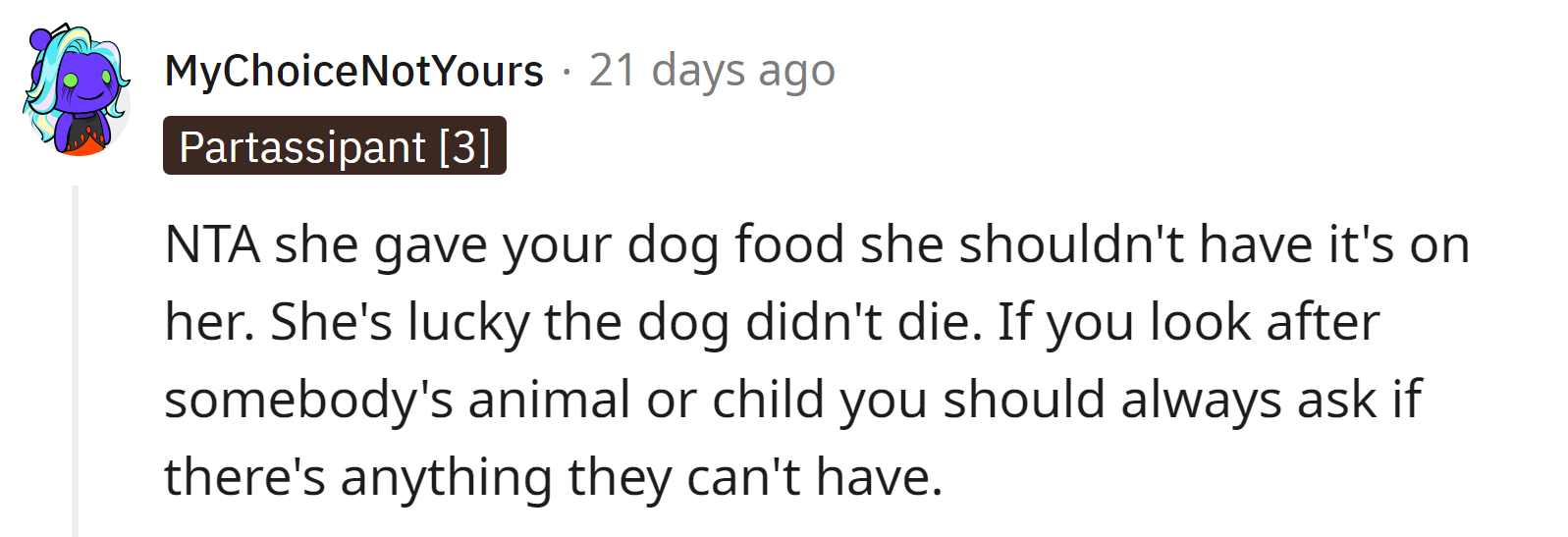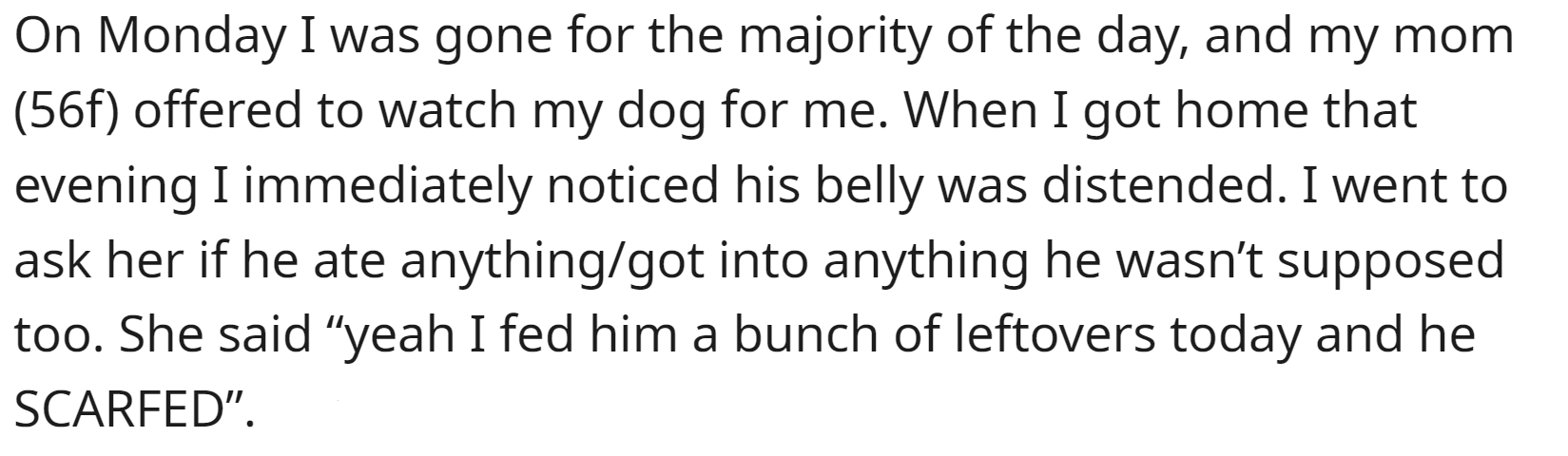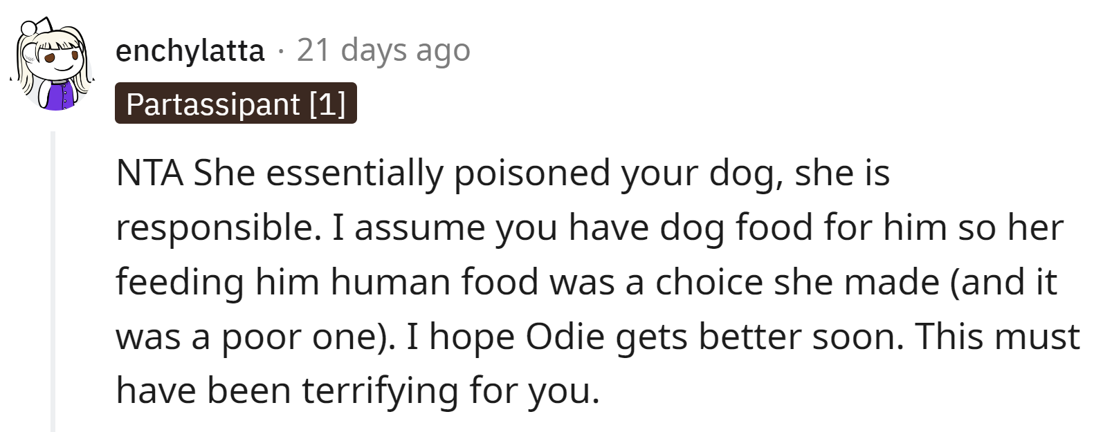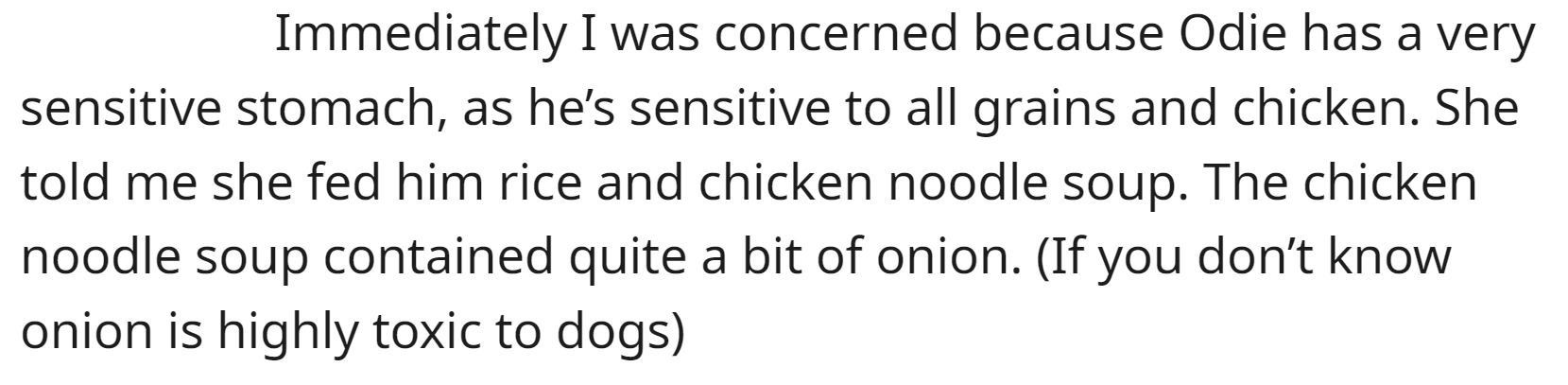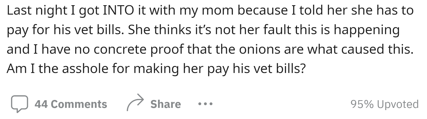 Let’s suppose the onions didn’t do this to Odie. The mother still fed him the exact stuff he is not supposed to eat. Chicken and rice soup. OP made it very clear in the story that the dog had a sensitive stomach in general and I am sure if she made this clear to us, she must’ve made this clear to her mother as well. OP was right for demanding the bills and the mother, rightfully, should pay them. OP was NTA in this story.
