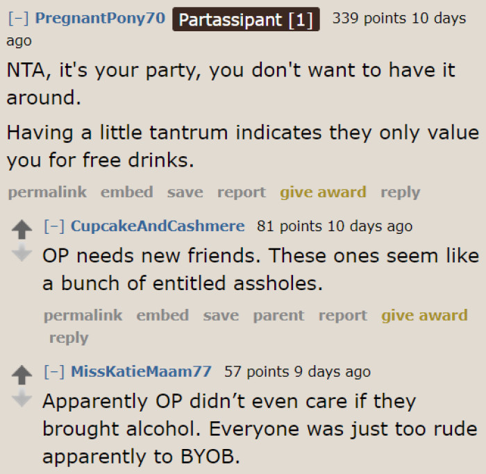 Expressing frustration, some individuals noted the immaturity displayed by these “adults” who exhibited a tantrum due to the absence of alcohol. A sentiment of congratulation for the OP on her special day appeared more appropriate.