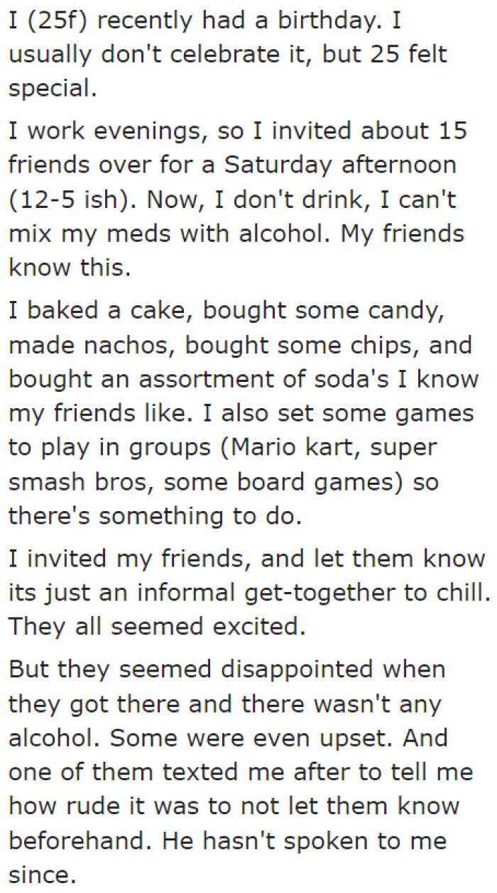 A woman hosted a birthday celebration, only to encounter her friends’ disapproval over the absence of alcohol.