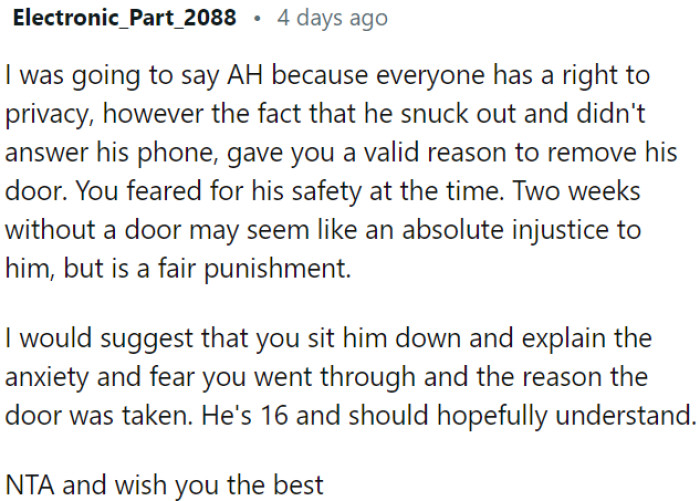 Alarmed by the possibilities, she chose to detach the door and uncovered his covert escapade to a party. A decision was made to keep the door removed until a replacement could be installed, a lesson she deemed fitting. This action stirred differing opinions, compounded by a heated exchange with her son, prompting her to seek external advice.