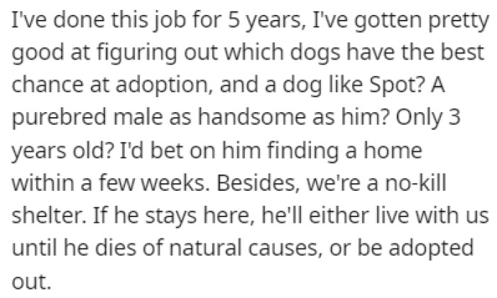 With five years of experience under her belt at the shelter, OP had honed her ability to identify dogs with a high potential for adoption. Spot, an exceptional purebred male just three years of age, perfectly fit the criteria. The shelter adhered to a compassionate no-kill policy, ensuring dogs like Spot had an opportunity to secure permanent loving homes.