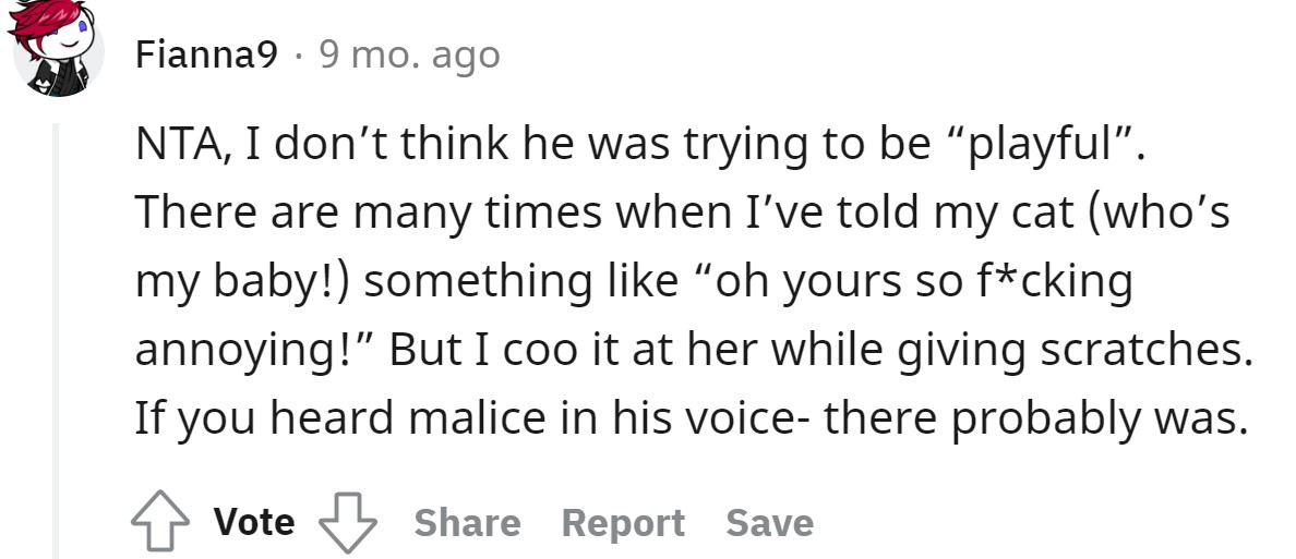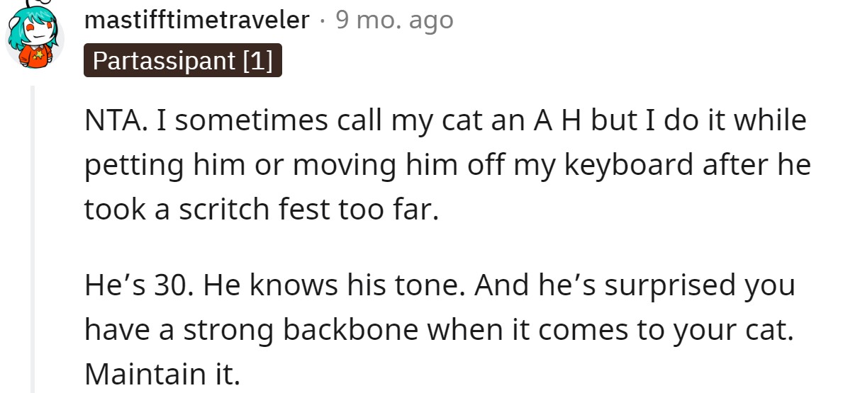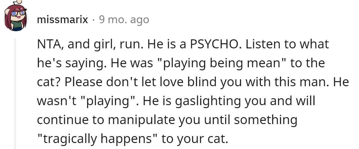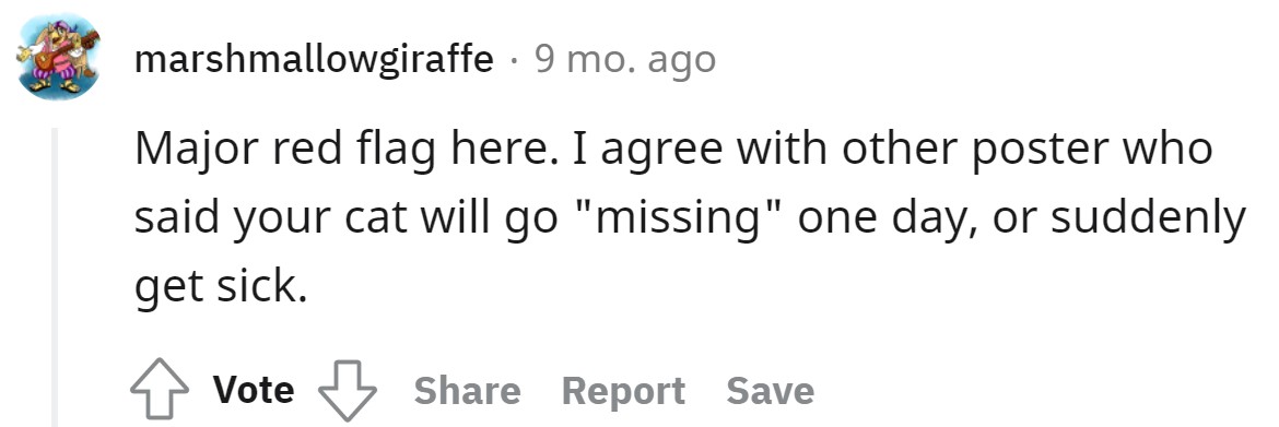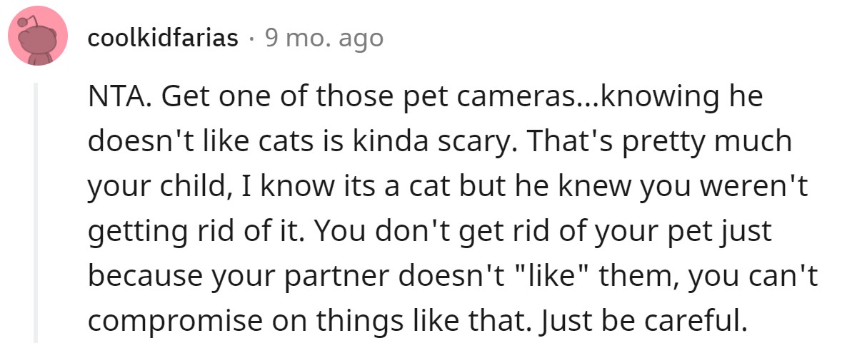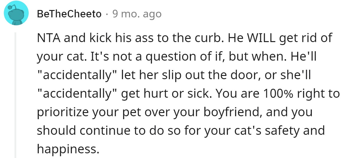 The situation takes an intriguing twist as a disheartening comment emerges from someone harboring a dislike for felines. While OP’s boyfriend may have a point, an undertone of malice raises concern. It serves as a potential red flag, warranting a closer examination of the circumstances. To unveil the truth, OP could consider employing a pet camera within her dwelling, offering a glimpse into her pet’s welfare during her absence. Failing to do so might result in an unfortunate disappearance or illness, leaving OP in the dark about her companion’s plight.