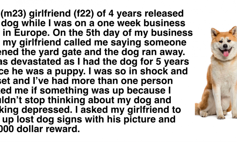 My (m23) girlfriend (f22) of 4 years released my dog while I was on a one week business trip in Europe. On the 5th day of my business trip my girlfriend called me saying someone opened the yard gate and the dog ran away. I was devastated as I had the dog for 5 years since he was a puppy. I was so in shock and upset and I’ve had more than one person asked me if something was up because I couldn’t stop thinking about my dog and looking depressed. I asked my girlfriend to put up lost dog signs with his picture and a 3000 dollar reward. When I came back my dog was still gone and I was thinking he was dead the whole time. 2 days after I came back I get a call saying they found my dog and I was very excited and my girlfriend said she was happy too but I knew that something was up when the vet that called me was 50 miles away. I drove up with my girlfriend and the vet said some old lady and her son found my dog on a trail and brought it to the vet.