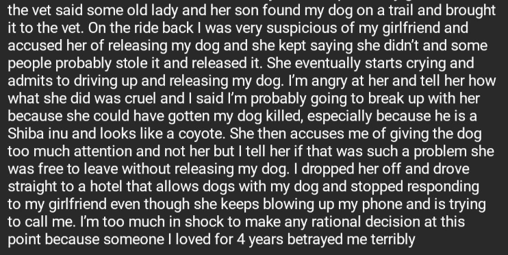 On the ride back I was very suspicious of my girlfriend and accused her of releasing my dog and she kept saying she didn’t and some people probably stole it and released it. She eventually starts crying and admits to driving up and releasing my dog. I’m angry at her and tell her how what she did was cruel and I said I’m probably going to break up with her because she could have gotten my dog killed, especially because he is a Shiba inu and looks like a coyote. She then accuses me of giving the dog too much attention and not her but I tell her if that was such a problem she was free to leave without releasing my dog. I dropped her off and drove straight to a hotel that allows dogs with my dog and stopped responding to my girlfriend even though she keeps blowing up my phone and is trying to call me. I’m too much in shock to make any rational decision at this point because someone I loved for 4 years betrayed me terribly