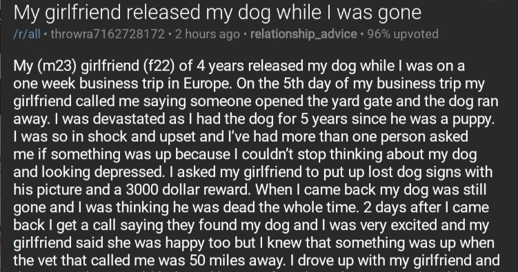 My (m23) girlfriend (f22) of 4 years released my dog while I was on a one week business trip in Europe. On the 5th day of my business trip my girlfriend called me saying someone opened the yard gate and the dog ran away. I was devastated as I had the dog for 5 years since he was a puppy. I was so in shock and upset and I’ve had more than one person asked me if something was up because I couldn’t stop thinking about my dog and looking depressed. I asked my girlfriend to put up lost dog signs with his picture and a 3000 dollar reward. When I came back my dog was still gone and I was thinking he was dead the whole time. 2 days after I came back I get a call saying they found my dog and I was very excited and my girlfriend said she was happy too but I knew that something was up when the vet that called me was 50 miles away. I drove up with my girlfriend and the vet said some old lady and her son found my dog on a trail and brought it to the vet.