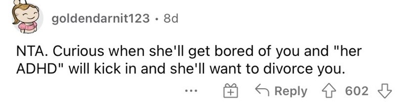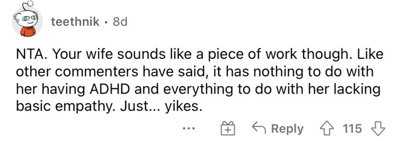 15.Practical advice enters the fray, urging the husband to delve into ADHD research and propose medication and therapy for his wife’s potential restoration to equilibrium.