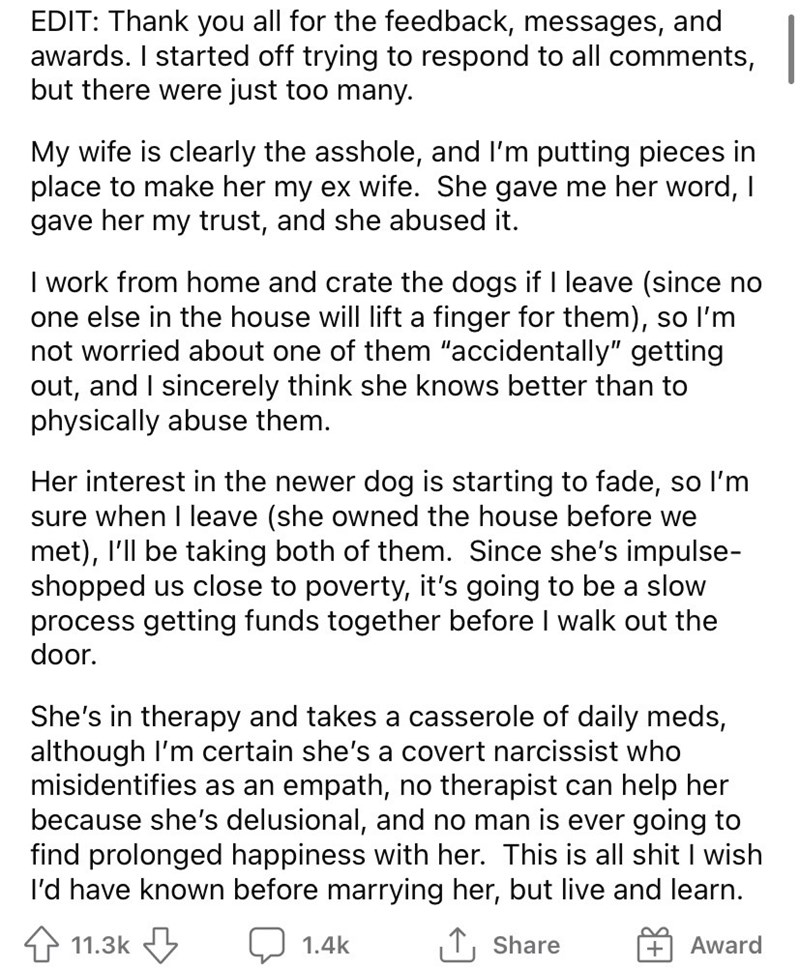 9. Amidst conjecture about ADHD, speculation looms regarding whether the wife’s actions toward her husband might mirror those exhibited toward her four-legged companions.