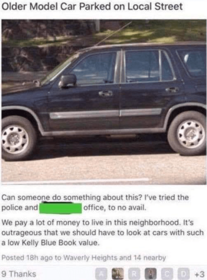 14. A Karen perturbed by an old, unsightly car obstructing her view.