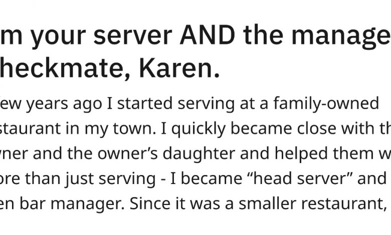 The tide swiftly turned as our server unveiled their managerial identity, thwarting her scheme.