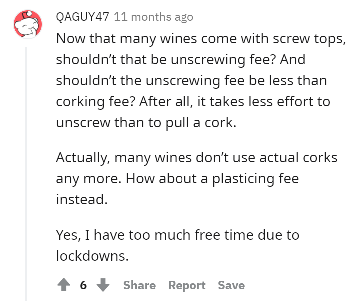 Anyways, there is an art to uncorking a bottle of wine and ensuring the service appears “upscale.” The more the customer thinks they know their shit about wine the more they’re likely to buy the more expensive bottles. And higher tips. Usually, it’s guys trying to impress a woman with how sophisticated he is (hint: your wine knowledge is rudimentary at best).