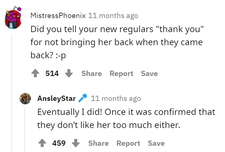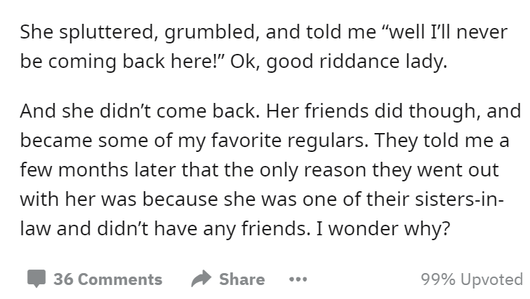Ironically, her companions shifted allegiance, morphing into regular patrons after the incident.
