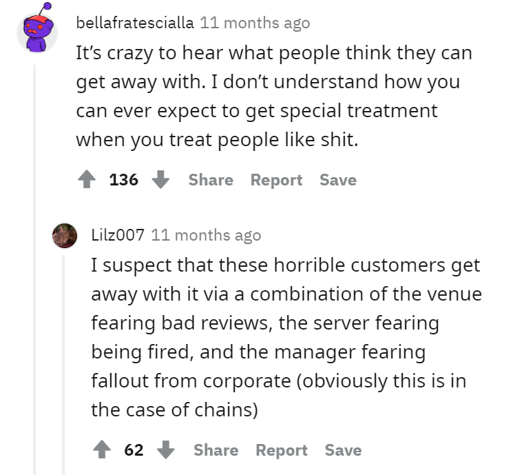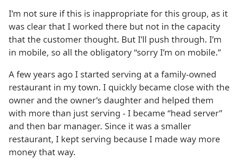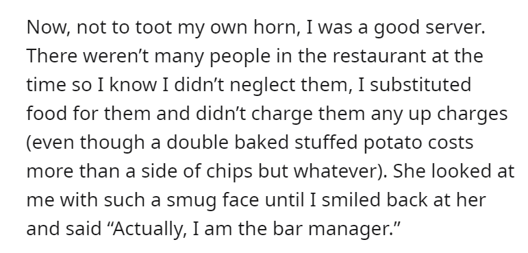 The tide swiftly turned as our server unveiled their managerial identity, thwarting her scheme.