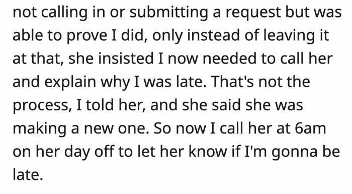 During a meeting, despite OP’s insistence that they had adhered to protocol, the micromanager introduced a new rule mandating that OP now call her personally to explain tardiness. Consequently, even on her days off, OP is now obliged to call the manager at 6AM when running late.
