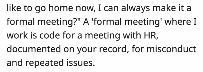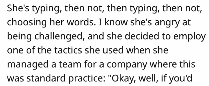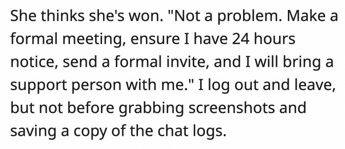 It’s essential to note that all of these interactions transpired on the company’s chat server. The manager proceeds to declare her intent to arrange a formal meeting via HR. Unbeknownst to her, OP has meticulously saved screenshots of their entire exchange as corroborating evidence.