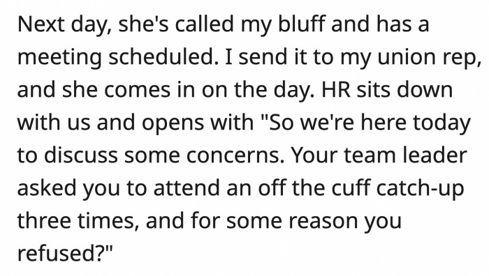 The following day, HR schedules a meeting, and OP informs their union representative. As the meeting commences, HR begins, “We’re here to address some concerns. Your team leader requested your attendance for an impromptu catch-up three times, and curiously, you declined each time?”