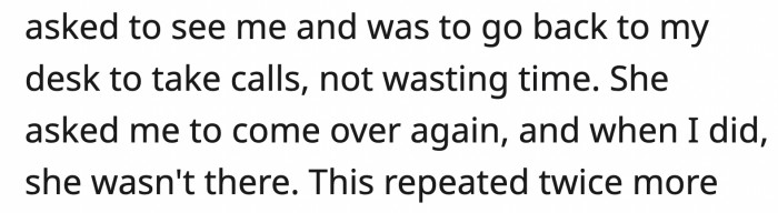 OP tactfully reminds the boss of her own instruction. Following this, the manager beckons OP to her desk three more times. Each time, the manager is conspicuously absent upon OP’s approach.