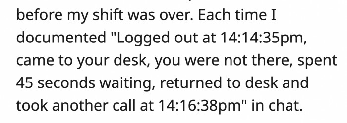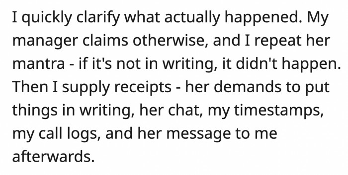 Then comes the twist: OP employs the manager’s own mantra, “if it’s not in writing, it didn’t happen.” OP presents the screenshots, along with timestamps and call logs, to substantiate their account.