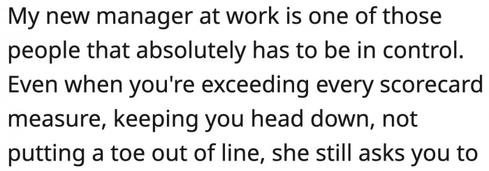 Even as u/nerdfury83 consistently exceeded their performance metrics and exhibited exemplary dedication, the new manager found opportunities to call them out over minor issues.