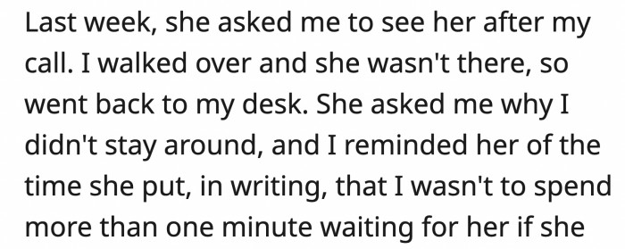The climax arrives when the micromanaging boss summons OP to her desk after a call. Upon arrival, OP is met with an empty desk. In this ironic twist, the manager asks OP why they didn’t wait, conveniently forgetting her previous directive not to wait more than a minute if she’s absent.