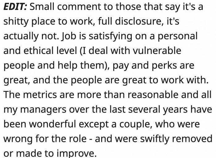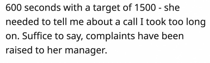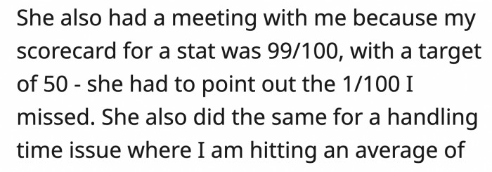 The saga takes an even more bewildering turn when the micromanager berates OP about their work ethic, despite consistently achieving top-notch results. A case in point is when OP scored 99/100 (with a goal of 50) and managed calls within 600 seconds (against a target of 1500 seconds). Astonishingly, the boss summoned OP for meetings, citing their “unacceptable” performance.
