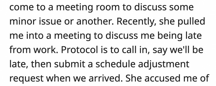 For instance, when the original poster (OP) had the rare instance of being tardy due to valid reasons and followed proper procedure by notifying the company and seeking a schedule adjustment, the manager’s dissatisfaction knew no bounds.
