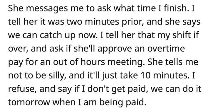 As the shift concludes, the manager again requests a meeting with OP. Seizing the moment, OP proposes attending only if paid overtime is approved; otherwise, a meeting can be scheduled the next day with compensation. The manager dismisses OP’s request as ridiculous, but OP stands firm.