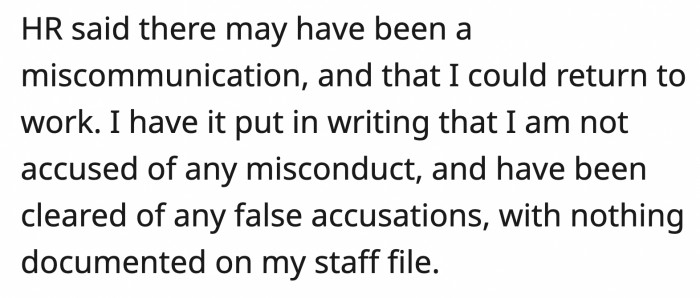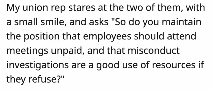 The union representative’s gaze bores into the manager and HR as they inquire about their support for the manager’s actions. HR hastily labels it a miscommunication, but OP persists, insisting on a written exoneration from false misconduct allegations.