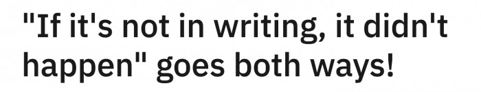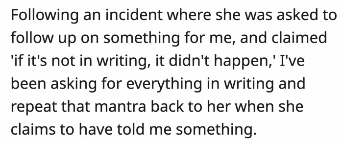 The situation devolves further. When the manager failed to follow through on her own commitments, she uttered the now-infamous line, “if it’s not in writing, it didn’t happen.” In response, OP begins insisting that the manager documents everything. To her claims of verbal communication, u/nerdfury83 echoes the manager’s own words right back.