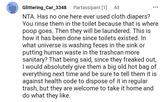 The parents voiced their displeasure regarding OP’s methodology, branding it “disgusting and unhygienic.” Despite sincere explanations, the parents remained steadfast in their belief that the undergarment should not have been rinsed in the toilet, as they feared it might impart undesirable habits to their child.