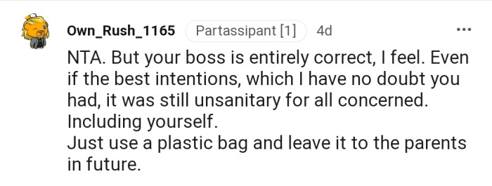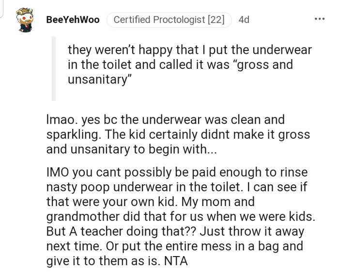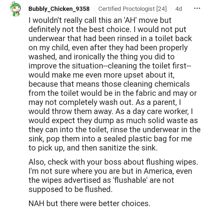 Interestingly, OP’s superiors rallied behind them during discussions with the aggrieved parents. Nonetheless, OP was cautioned against repeating the act of rinsing underwear in the toilet.
