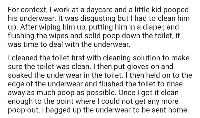 OP has undeniably gleaned a valuable lesson from this experience. In the future, the parents might find themselves facing a less than pleasant task if their child encounters another mishap in the realm of underwear hygiene.
