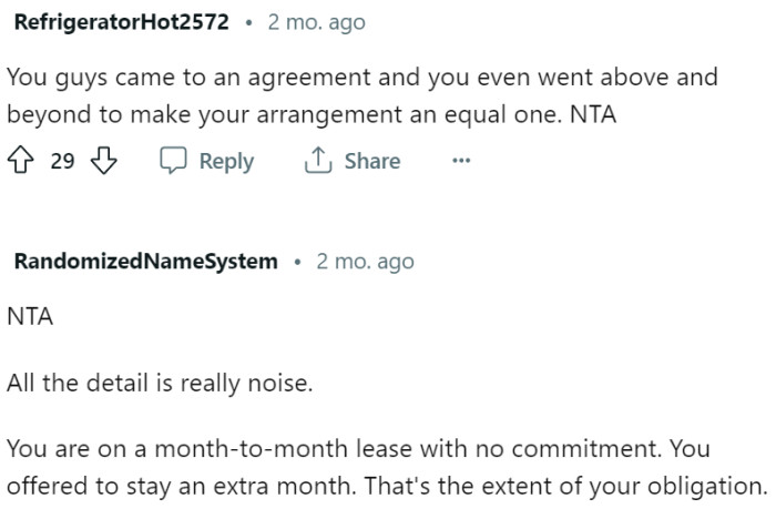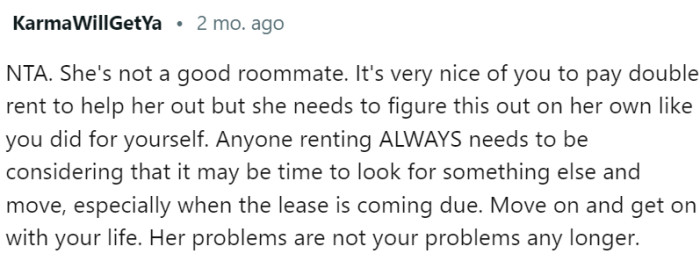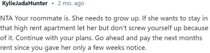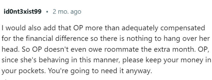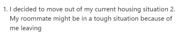 Now, as OP prepares to embark on her upcoming housing journey, she grapples with feelings of guilt stemming from her choice and the somewhat turbulent conclusion of their shared dwelling experience. Her dedication to doing right by her cohabitant while also addressing her own needs remains steadfast.
