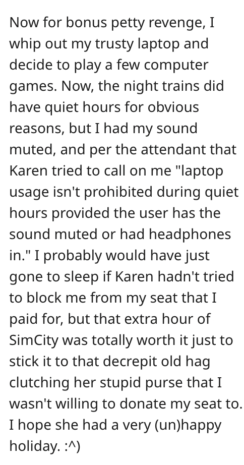 3. A whimsical yet effective tactic takes shape in OP’s mind – a game of SimCity, subtly undermining Karen’s self-imposed reign over the seat. With muted sound to circumvent rebuke, OP navigates the game world while Karen unwittingly becomes the object of a subtle lesson.