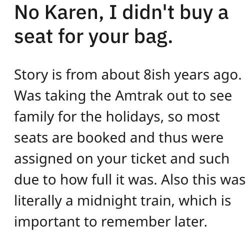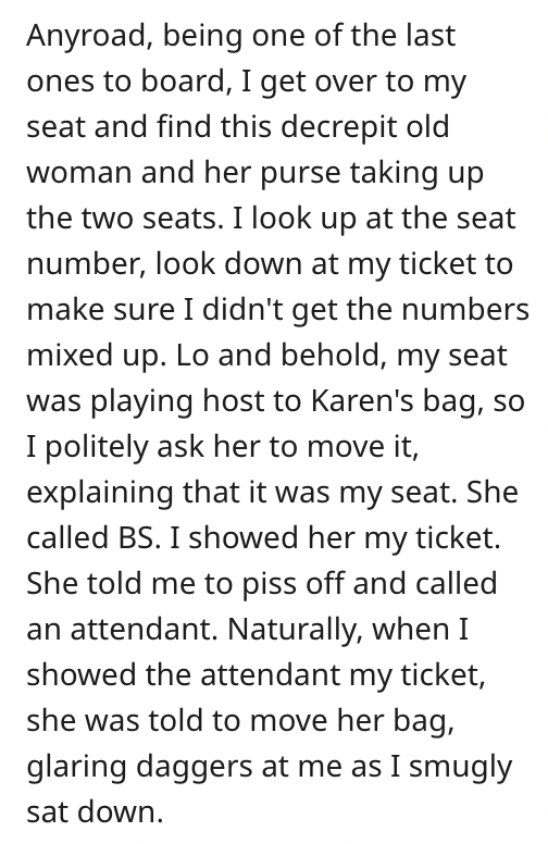 2. The timely boarding is marred by the unsettling sight of an entitled passenger, Karen, who unabashedly appropriates OP’s seat as a makeshift storage for her bag. Though the intervention of a vigilant attendant resolves the issue, OP’s desire for a fitting response intensifies.