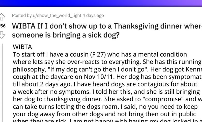 Notably, the cousin tends to react excessively when her desires are not met. Despite the OP’s warning about the contagious nature of kennel cough, the cousin remains steadfast in her decision to bring the dog to the Thanksgiving dinner.