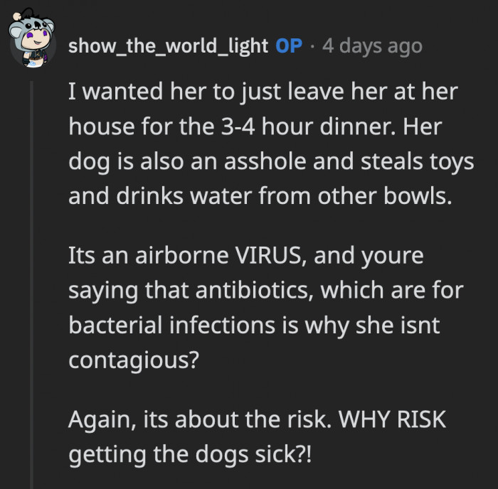 It is evident that the cousin’s sense of entitlement extends to her dog, which exhibits behaviors such as toy theft and using other dogs’ bowls. Given these concerns, the OP is resolute in her decision not to subject her dog to a contagious environment.