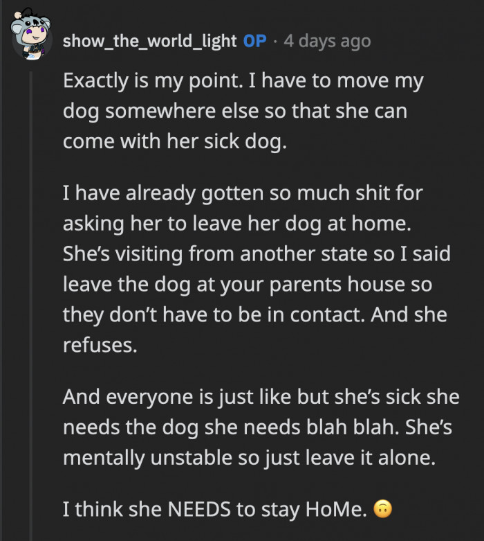 In alignment with her principle, the OP is steadfast in asserting that she will not attend if the contagious dog is present. Maintaining this stance is crucial for her and her dog’s well-being.