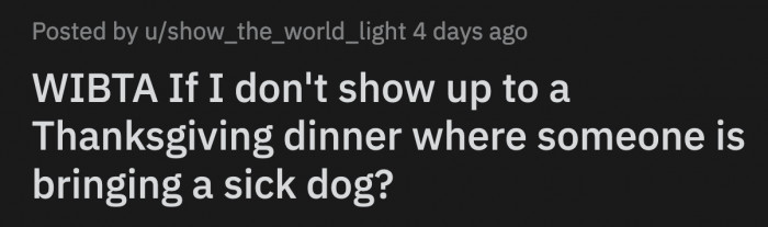 Contemplating the health of her own dog, the OP deliberates whether bowing out of this year’s Thanksgiving gathering might be the wisest course of action.