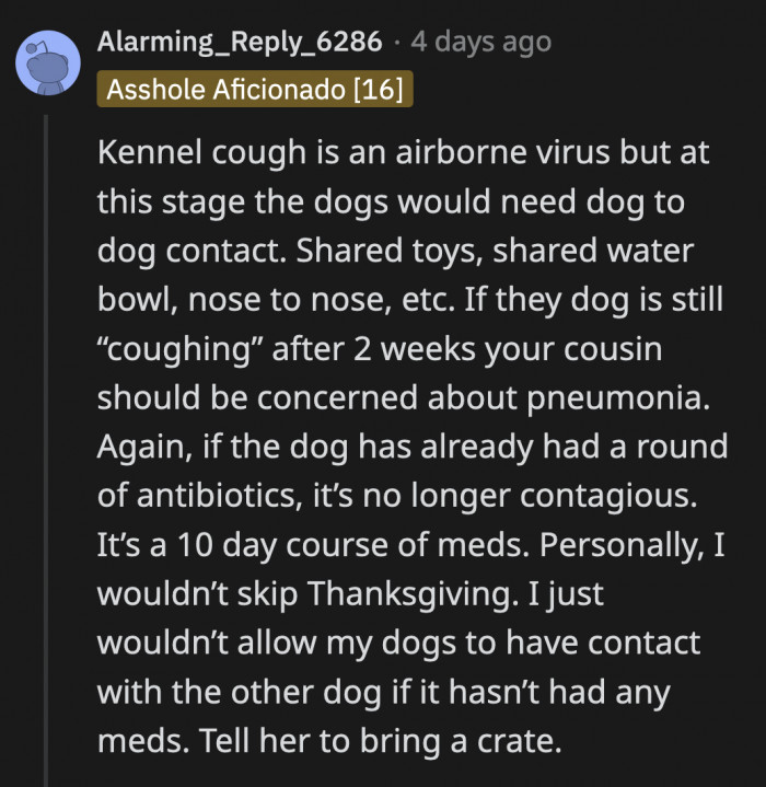 Notably, the cousin tends to react excessively when her desires are not met. Despite the OP’s warning about the contagious nature of kennel cough, the cousin remains steadfast in her decision to bring the dog to the Thanksgiving dinner.