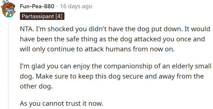 Amidst these complex circumstances, the OP confronts two choices. The first entails securing a harmonious home for her aging yet aggressive dog. Alternatively, she grapples with the weighty decision of euthanasia.
