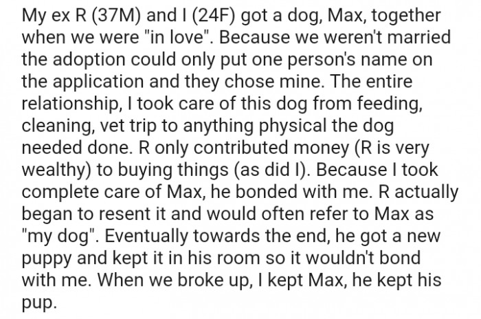 While some may indeed contemplate selling their dog, the Reddit community witnessed a different stance from one user. In a post on the renowned r/AITA subreddit, a 24-year-old individual, the Original Poster (OP), recounted a scenario where her ex-partner expressed interest in purchasing her beloved dog, Max, following the passing of his own canine companion.