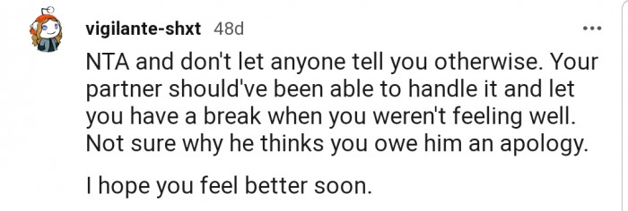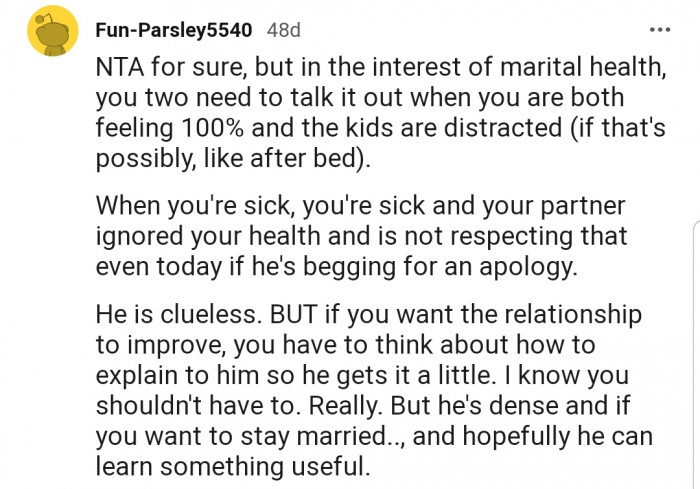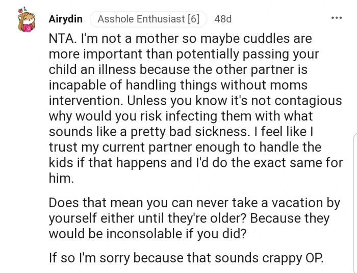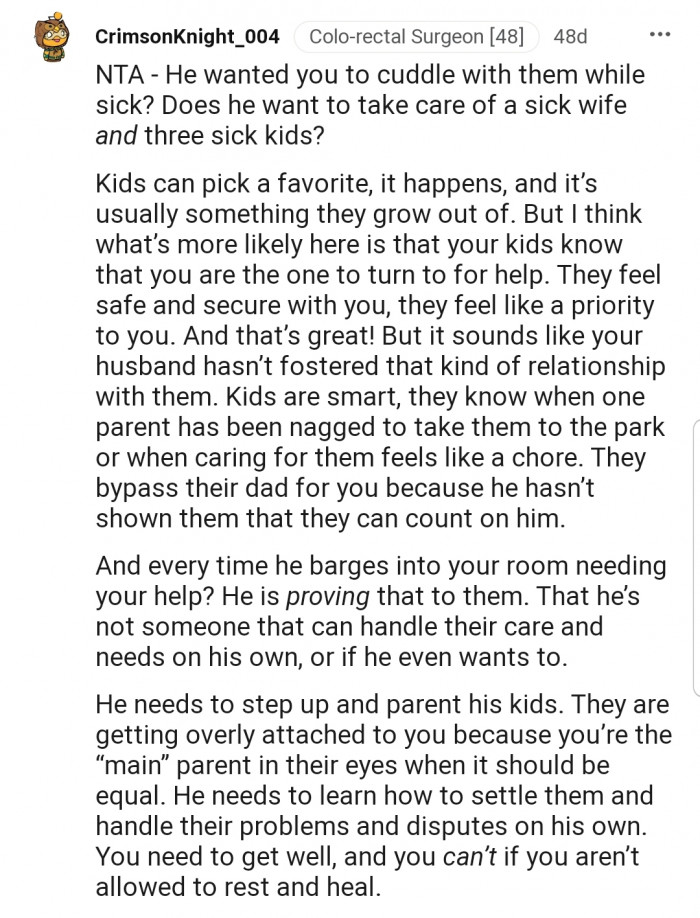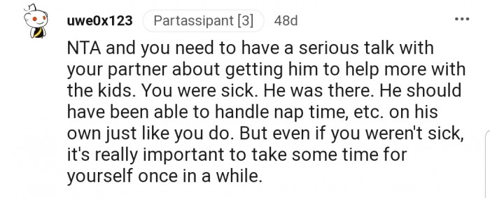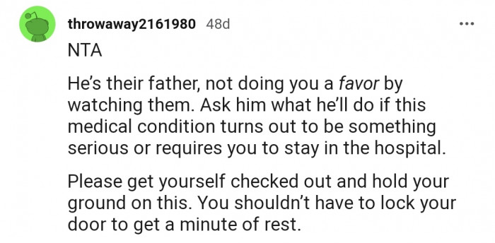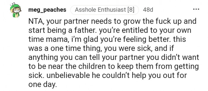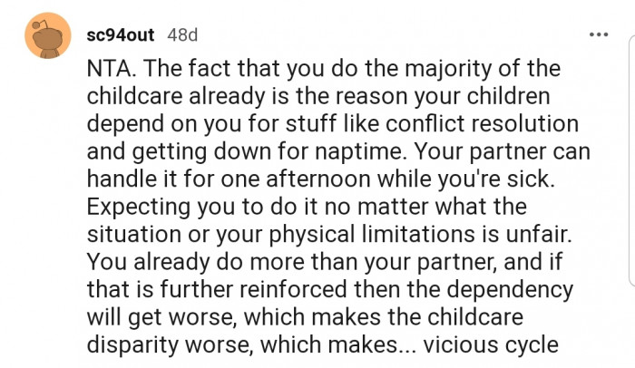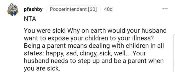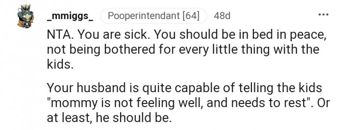 “NTA. While you’re unwell, you deserve peaceful rest, free from constant child-related interruptions.”