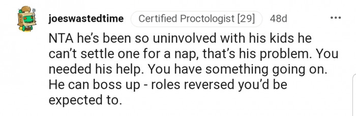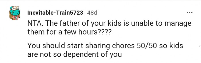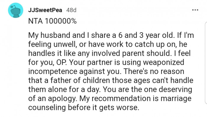 Regrettably, OP’s husband struggled to manage the children’s needs, resulting in them repeatedly interrupting her much-needed rest. This culminated in OP’s outburst of frustration.