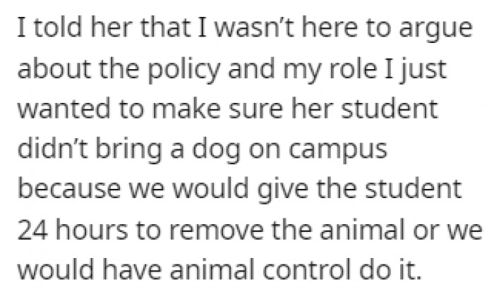 Seeking to prevent any future conflicts, the Reddit user approached the parent and elucidated the policy forbidding students from having pets on campus. This explanation was met with a sense of hypocrisy from the parent’s perspective, given that the Reddit user themselves was a pet owner. In response, the Reddit user emphasized that students had a 24-hour window to remove any pets from campus premises, failing which animal control would be notified.