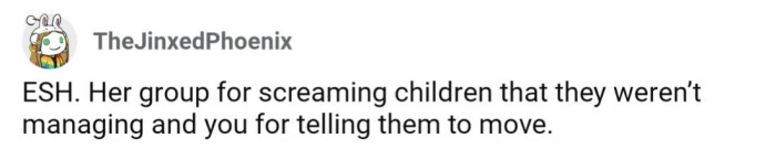 Following the confrontation, the group with children relocated, but OP’s spouse accused her of overstepping: