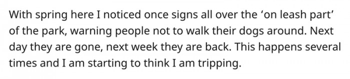 As spring unfurls its embrace, the OP becomes attuned to a peculiar phenomenon—a series of signs declaring the leash mandate in the children’s play zone. Yet, a curious inconsistency emerges—the signs exhibit an ephemeral existence, vanishing and resurfacing with each passing day.