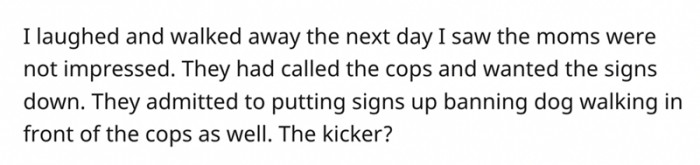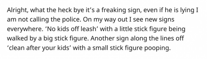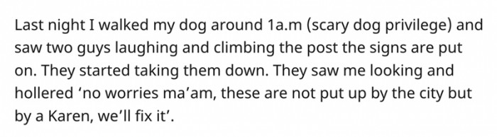 The two young men caught in the act reassured the OP that these signs were not municipal decrees but the handiwork of a certain Karen, assuring, “we’ll fix it.” The OP’s response is marked by an admirable indifference to their veracity, eschewing any urge to involve the authorities.